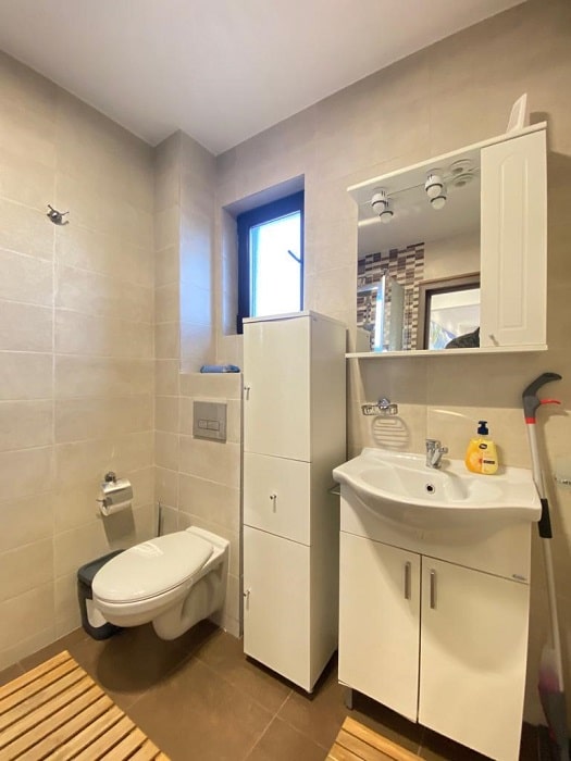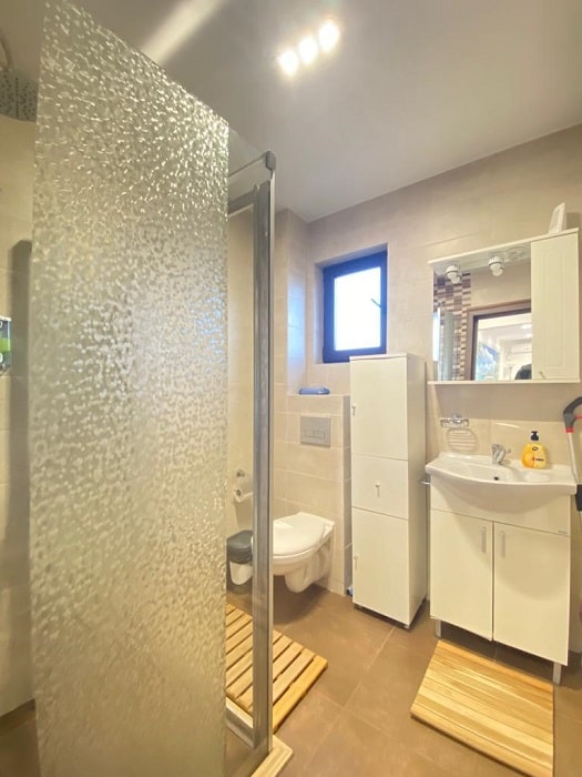 Baia este dotată cu un duș tip walk-in, uscător de păr, prosoape și cosmetice hoteliere de unică folosință.