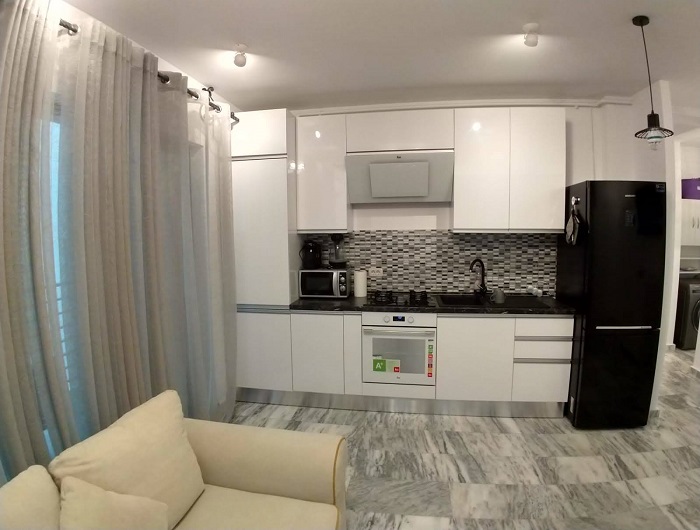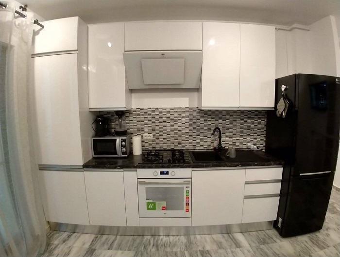 Bucătăria open space este complet utilată, inclusiv cu cuptor electric, plită, cuptor cu microunde și espressor pentru a vă bucura de preparatele preferate în timpul șederii dumneavoastră.