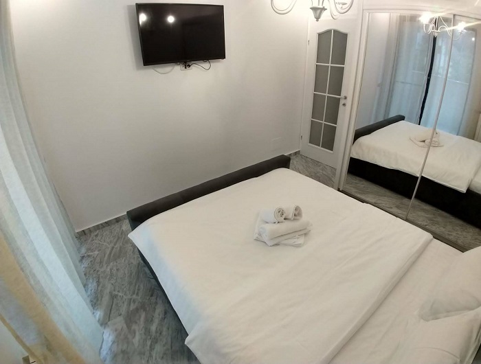 Dormitorul este amenajat cu un pat matrimonial, dressing, TV și balcon privat, oferind un spațiu intim și confortabil pentru odihnă și relaxare.
